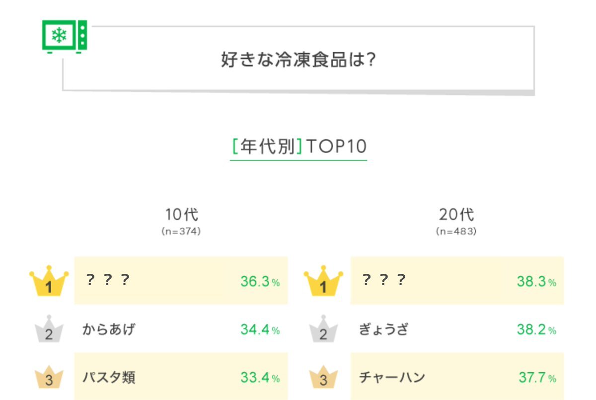 データは何を伝えたいかで見せ方が変わる。添付の好きな冷凍食品ランキング(LINEリサーチ)を例にとる。 画像①年代別ランキング ◯◯代が喜ぶものを選ぶ。そんなシーンで便利な表になる。 画像②選択肢×年代 「ぎょうざ、10代はイマイチ好きじゃないの?」といったことが読み取れる。 pic.x.com/6QPvTFOvTh x.com/LINESurveys_JP…